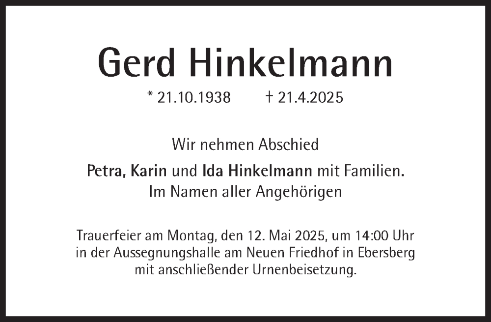 Hier finden Sie alle Traueranzeigen aus der Zeitung, die bisher für Gerd Hinkelmann erschienen sind. Weitere Traueranzeigen, die in der Zeitung erscheinen, werden hier ebenfalls aufgelistet