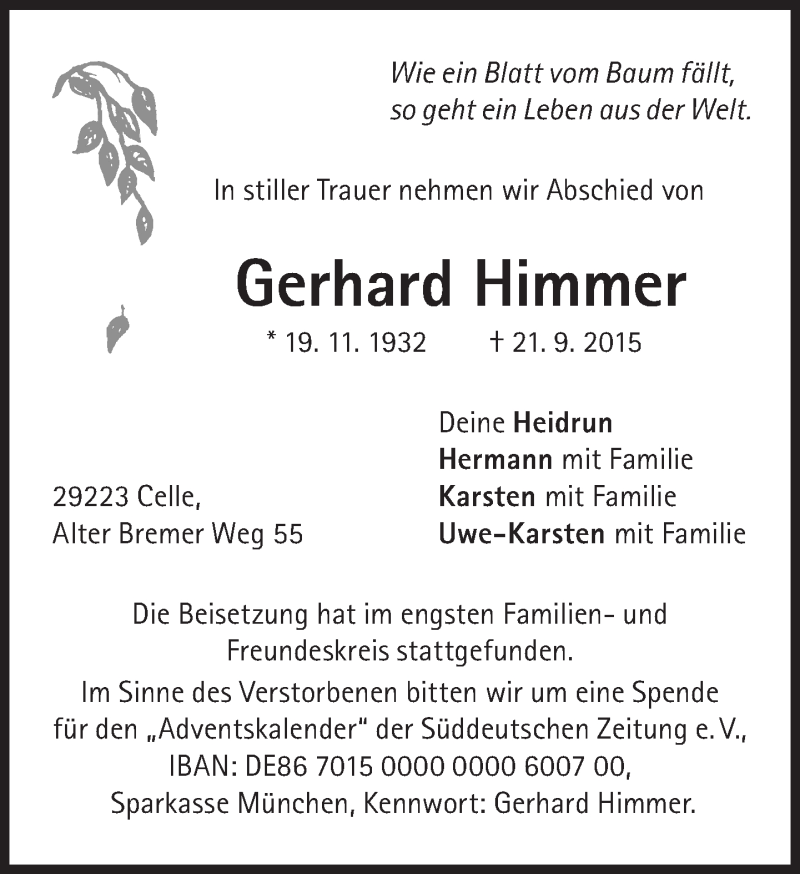 Hier finden Sie alle Traueranzeigen aus der Zeitung, die bisher für Gerhard Himmer erschienen sind. Weitere Traueranzeigen, die in der Zeitung erscheinen, werden hier ebenfalls aufgelistet