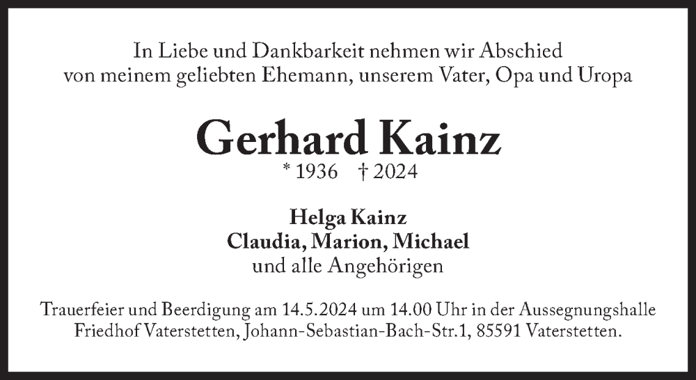 Hier finden Sie alle Traueranzeigen aus der Zeitung, die bisher für Gerhard Kainz erschienen sind. Weitere Traueranzeigen, die in der Zeitung erscheinen, werden hier ebenfalls aufgelistet
