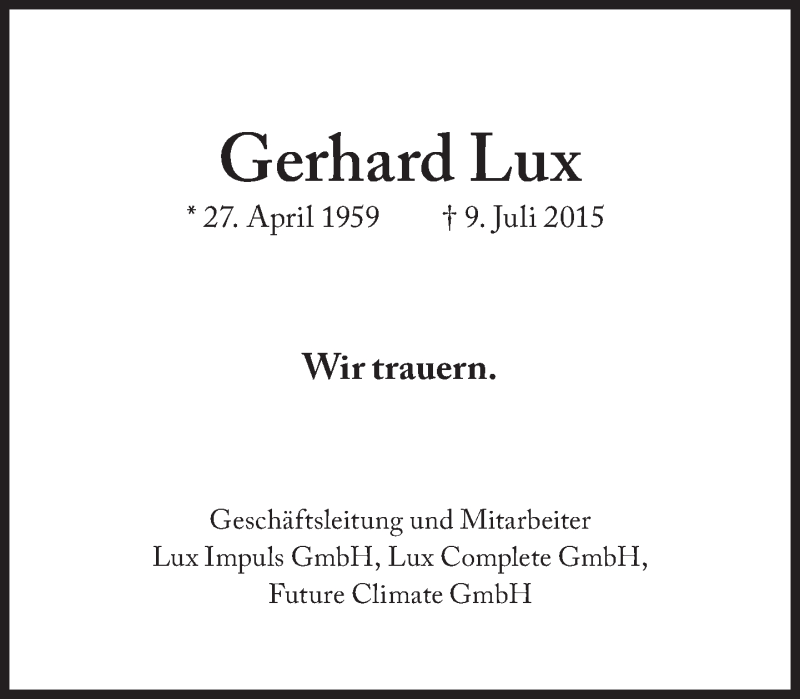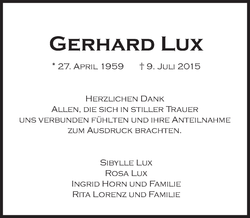 Hier finden Sie alle Traueranzeigen aus der Zeitung, die bisher für Gerhard Lux erschienen sind. Weitere Traueranzeigen, die in der Zeitung erscheinen, werden hier ebenfalls aufgelistet