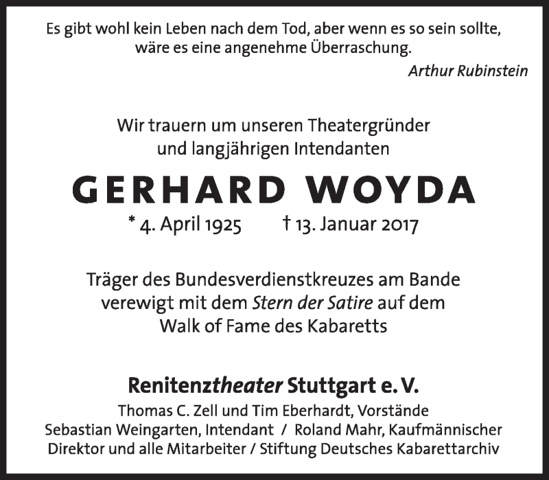 Hier finden Sie alle Traueranzeigen aus der Zeitung, die bisher für Gerhard Woyda erschienen sind. Weitere Traueranzeigen, die in der Zeitung erscheinen, werden hier ebenfalls aufgelistet