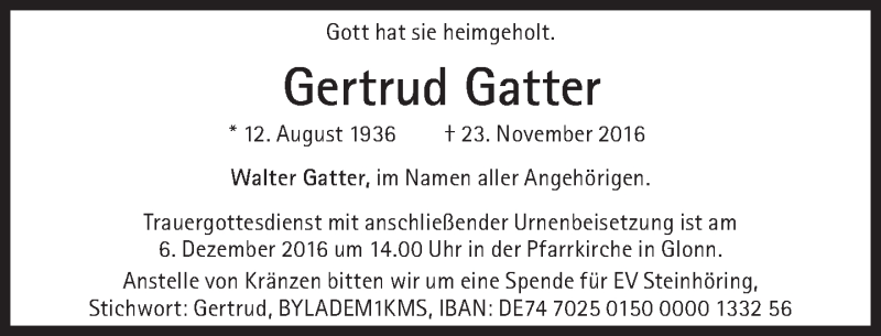 Hier finden Sie alle Traueranzeigen aus der Zeitung, die bisher für Gertrud Gatter erschienen sind. Weitere Traueranzeigen, die in der Zeitung erscheinen, werden hier ebenfalls aufgelistet