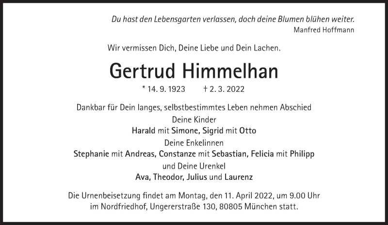 Hier finden Sie alle Traueranzeigen aus der Zeitung, die bisher für Gertrud Himmelhan erschienen sind. Weitere Traueranzeigen, die in der Zeitung erscheinen, werden hier ebenfalls aufgelistet