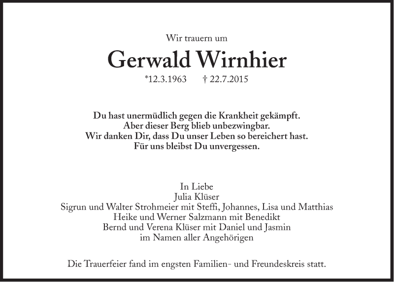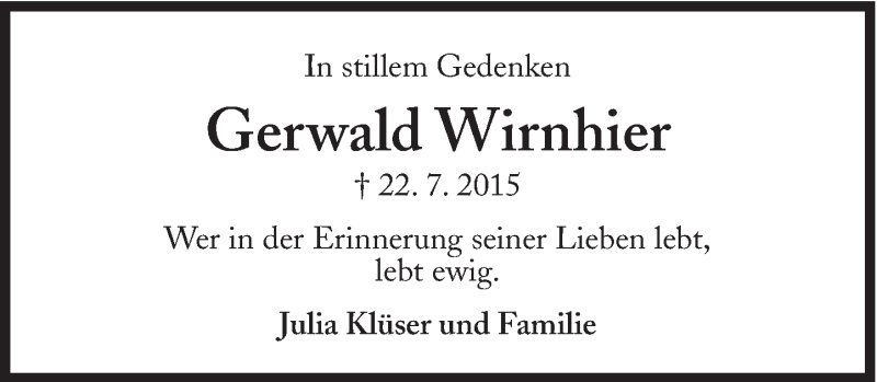 Hier finden Sie alle Traueranzeigen aus der Zeitung, die bisher für Gerwald Wirnhier erschienen sind. Weitere Traueranzeigen, die in der Zeitung erscheinen, werden hier ebenfalls aufgelistet