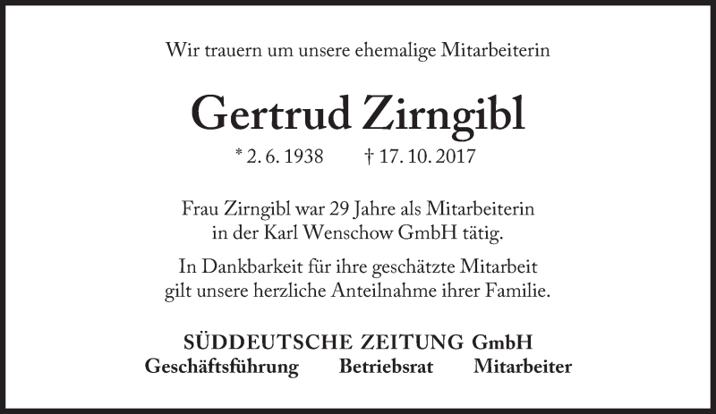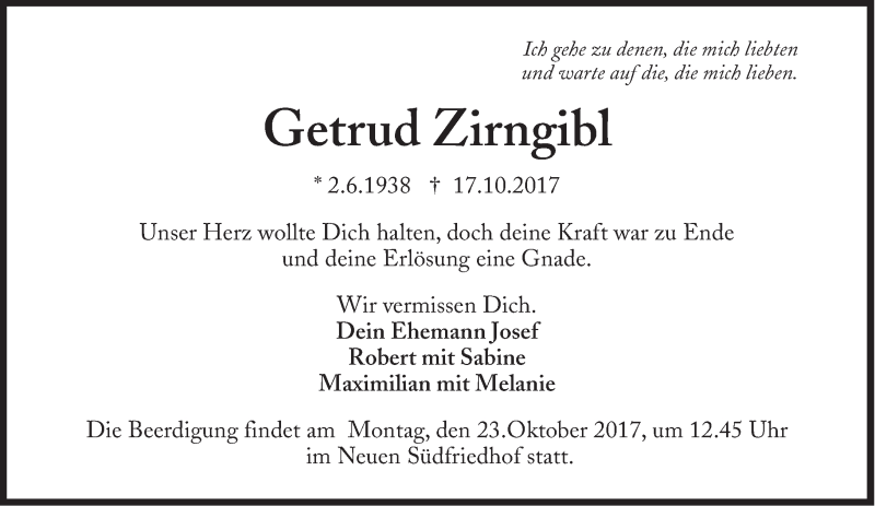 Hier finden Sie alle Traueranzeigen aus der Zeitung, die bisher für Getrud Zirngibl erschienen sind. Weitere Traueranzeigen, die in der Zeitung erscheinen, werden hier ebenfalls aufgelistet