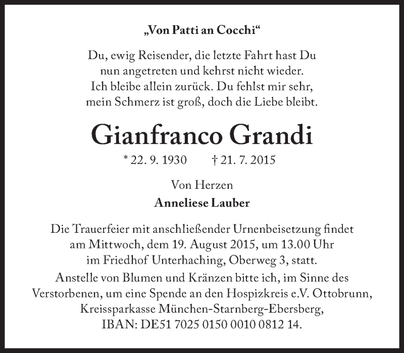 Hier finden Sie alle Traueranzeigen aus der Zeitung, die bisher für Gianfranco Grandi erschienen sind. Weitere Traueranzeigen, die in der Zeitung erscheinen, werden hier ebenfalls aufgelistet