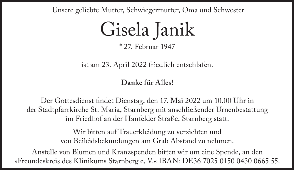 Hier finden Sie alle Traueranzeigen aus der Zeitung, die bisher für Gisela Janik erschienen sind. Weitere Traueranzeigen, die in der Zeitung erscheinen, werden hier ebenfalls aufgelistet