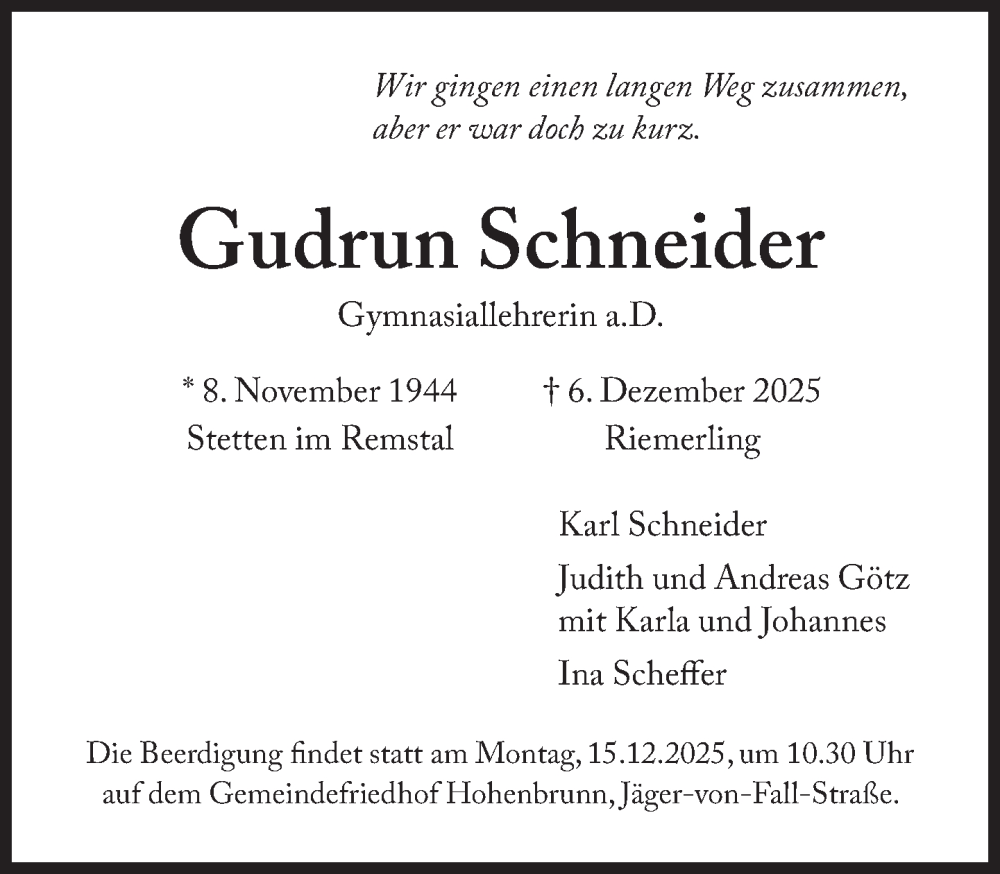 Hier finden Sie alle Traueranzeigen aus der Zeitung, die bisher für Gudrun Schneider erschienen sind. Weitere Traueranzeigen, die in der Zeitung erscheinen, werden hier ebenfalls aufgelistet