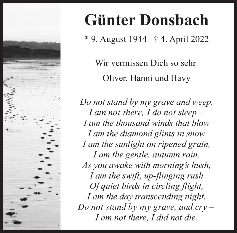 Hier finden Sie alle Traueranzeigen aus der Zeitung, die bisher für Günter Donsbach erschienen sind. Weitere Traueranzeigen, die in der Zeitung erscheinen, werden hier ebenfalls aufgelistet