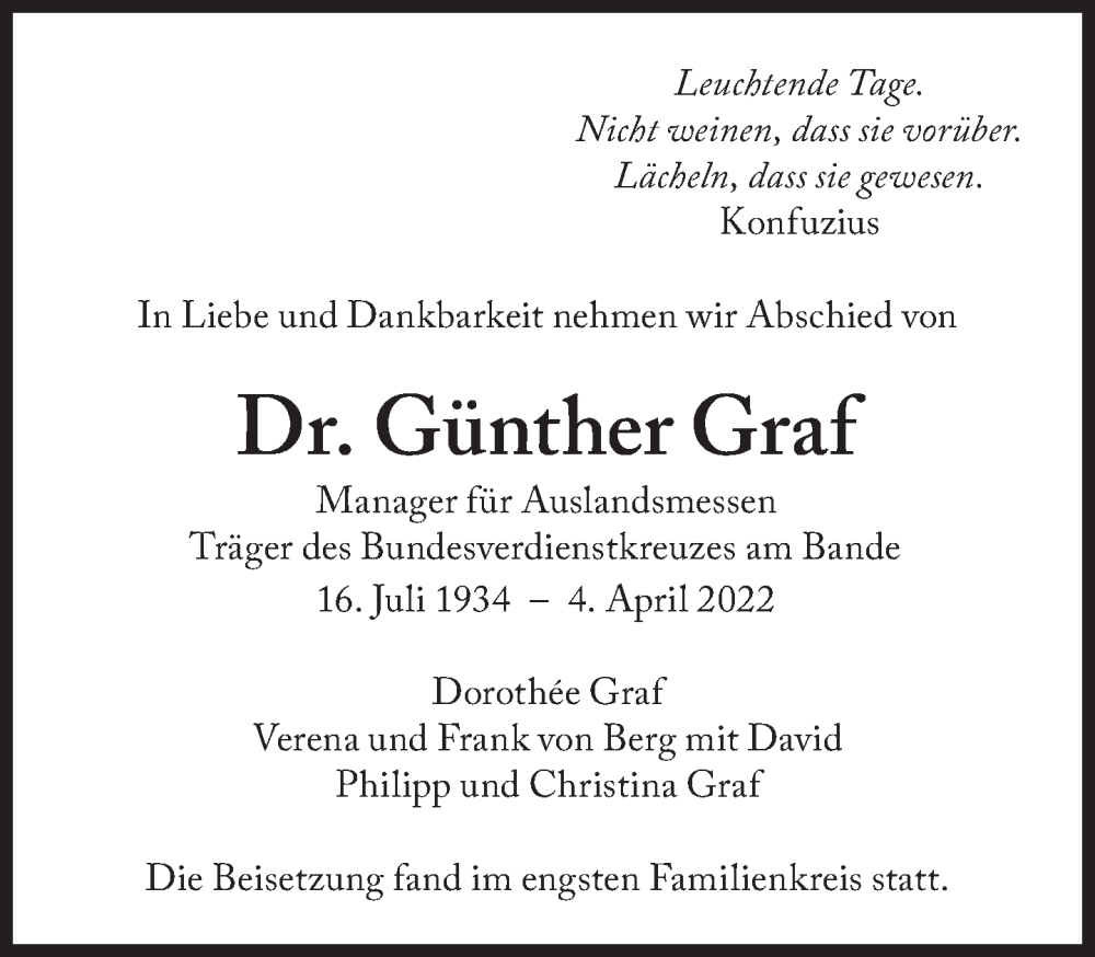 Hier finden Sie alle Traueranzeigen aus der Zeitung, die bisher für Günther Graf erschienen sind. Weitere Traueranzeigen, die in der Zeitung erscheinen, werden hier ebenfalls aufgelistet