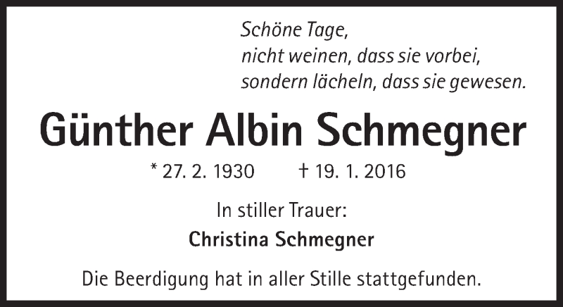 Hier finden Sie alle Traueranzeigen aus der Zeitung, die bisher für Günther Albin Schmegner erschienen sind. Weitere Traueranzeigen, die in der Zeitung erscheinen, werden hier ebenfalls aufgelistet