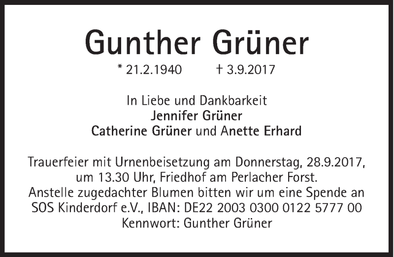 Hier finden Sie alle Traueranzeigen aus der Zeitung, die bisher für Gunther Grüner erschienen sind. Weitere Traueranzeigen, die in der Zeitung erscheinen, werden hier ebenfalls aufgelistet