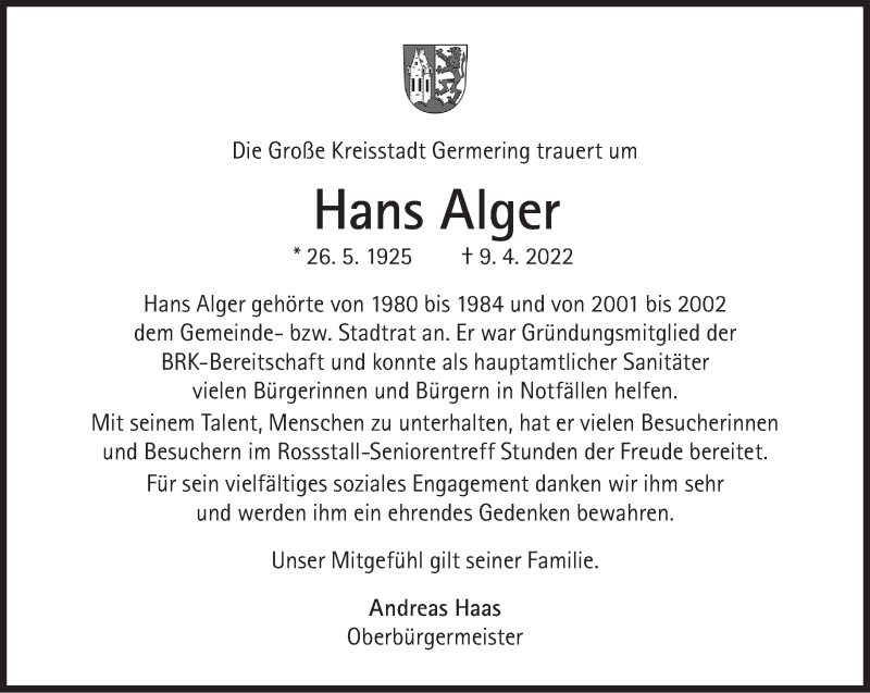 Hier finden Sie alle Traueranzeigen aus der Zeitung, die bisher für Hans Alger erschienen sind. Weitere Traueranzeigen, die in der Zeitung erscheinen, werden hier ebenfalls aufgelistet