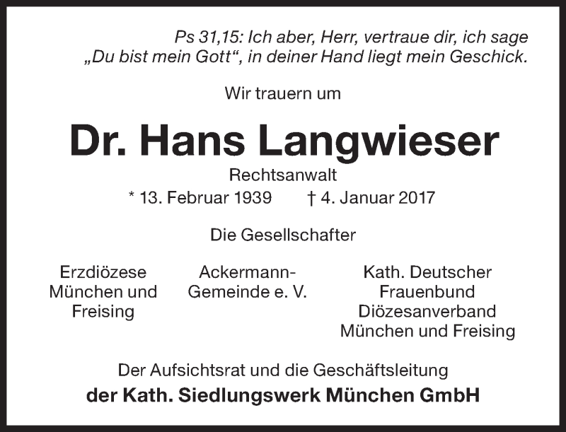 Hier finden Sie alle Traueranzeigen aus der Zeitung, die bisher für Hans Langwieser erschienen sind. Weitere Traueranzeigen, die in der Zeitung erscheinen, werden hier ebenfalls aufgelistet