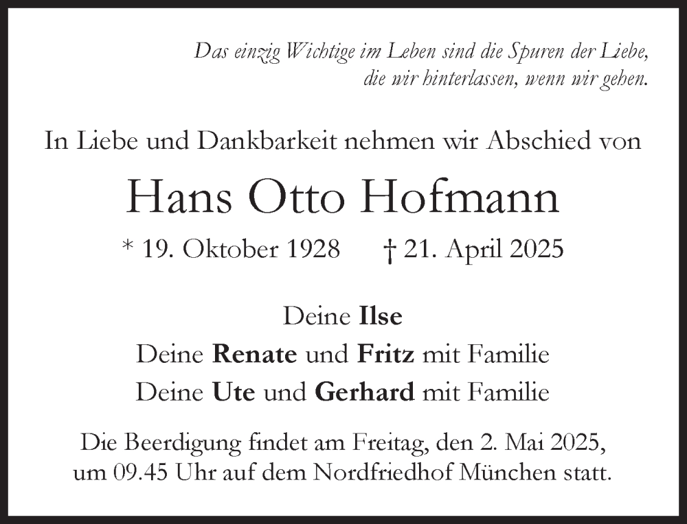 Hier finden Sie alle Traueranzeigen aus der Zeitung, die bisher für Hans Otto Hofmann erschienen sind. Weitere Traueranzeigen, die in der Zeitung erscheinen, werden hier ebenfalls aufgelistet