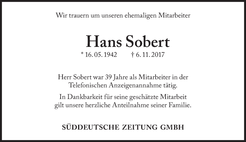 Hier finden Sie alle Traueranzeigen aus der Zeitung, die bisher für Hans Sobert erschienen sind. Weitere Traueranzeigen, die in der Zeitung erscheinen, werden hier ebenfalls aufgelistet