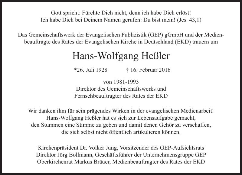 Hier finden Sie alle Traueranzeigen aus der Zeitung, die bisher für Hans-Wolfgang Heßler erschienen sind. Weitere Traueranzeigen, die in der Zeitung erscheinen, werden hier ebenfalls aufgelistet