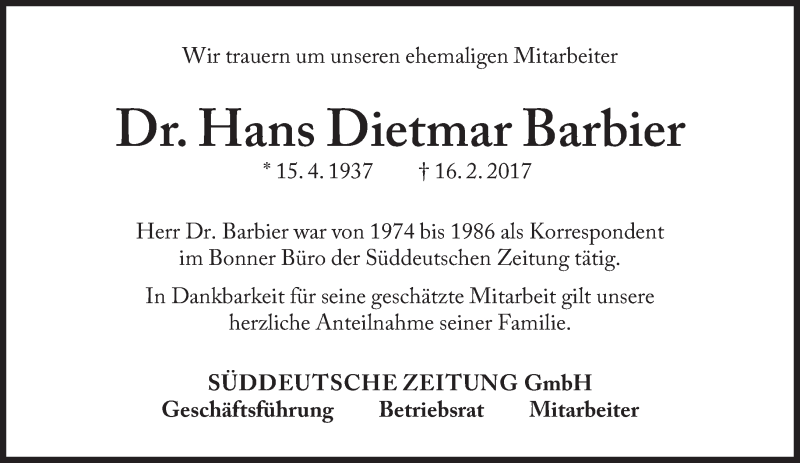 Hier finden Sie alle Traueranzeigen aus der Zeitung, die bisher für Hans Dietmar Barbier erschienen sind. Weitere Traueranzeigen, die in der Zeitung erscheinen, werden hier ebenfalls aufgelistet