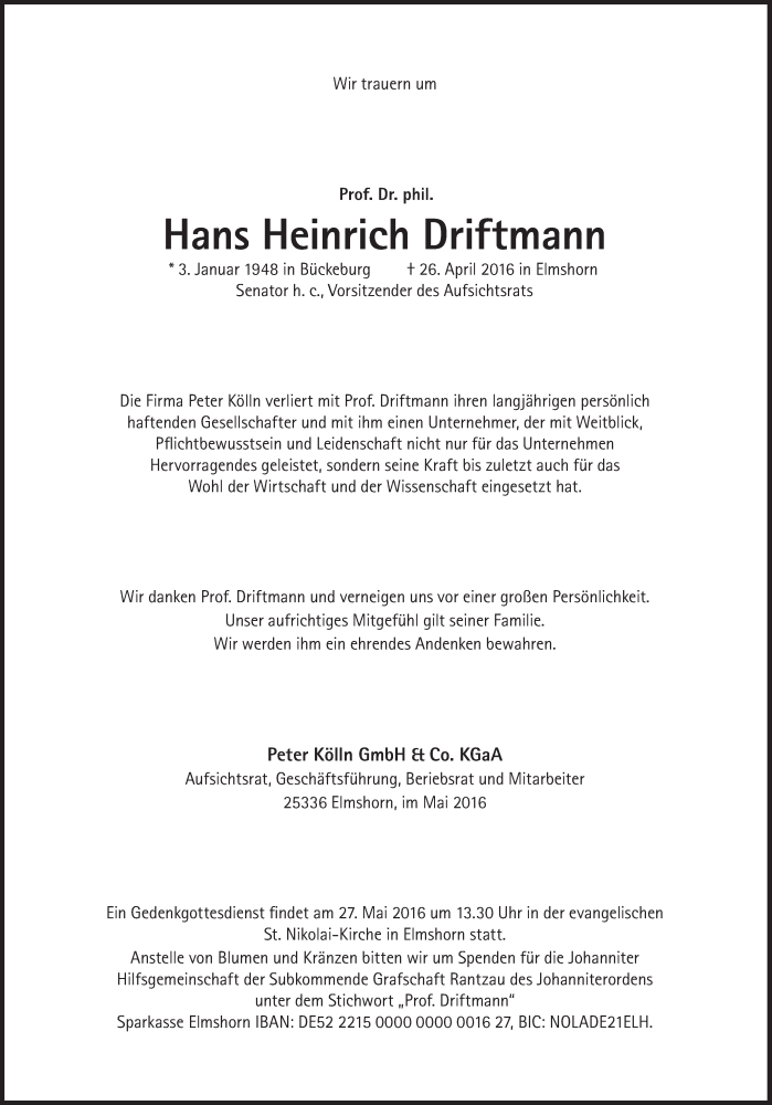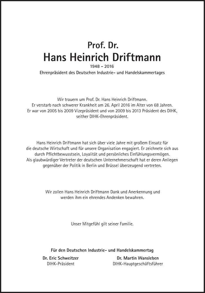 Hier finden Sie alle Traueranzeigen aus der Zeitung, die bisher für Hans Heinrich Driftmann erschienen sind. Weitere Traueranzeigen, die in der Zeitung erscheinen, werden hier ebenfalls aufgelistet