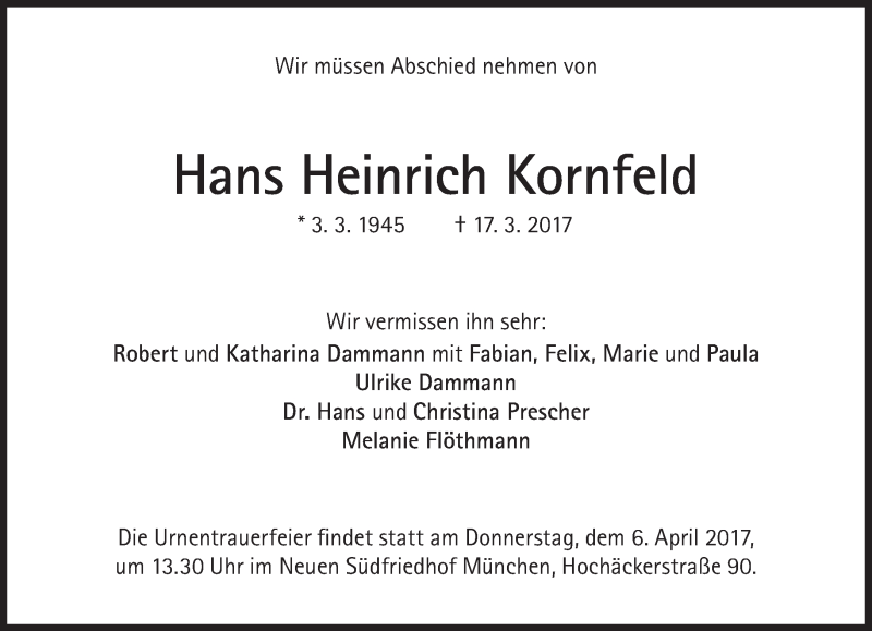 Hier finden Sie alle Traueranzeigen aus der Zeitung, die bisher für Hans Heinrich Kornfeld erschienen sind. Weitere Traueranzeigen, die in der Zeitung erscheinen, werden hier ebenfalls aufgelistet