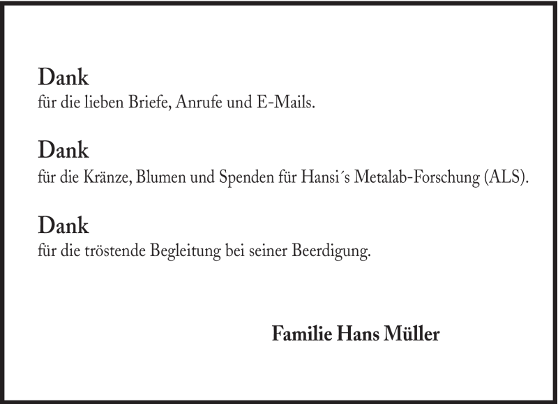 Hier finden Sie alle Traueranzeigen aus der Zeitung, die bisher für Hansi Müller erschienen sind. Weitere Traueranzeigen, die in der Zeitung erscheinen, werden hier ebenfalls aufgelistet