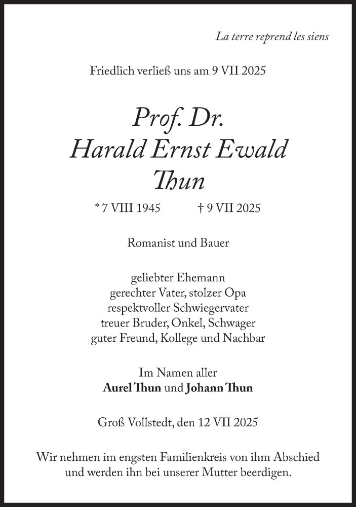 Hier finden Sie alle Traueranzeigen aus der Zeitung, die bisher für Harald Ernst Ewald Thun erschienen sind. Weitere Traueranzeigen, die in der Zeitung erscheinen, werden hier ebenfalls aufgelistet