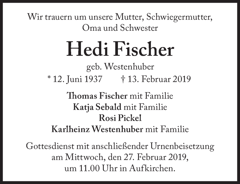 Hier finden Sie alle Traueranzeigen aus der Zeitung, die bisher für Hedi Fischer erschienen sind. Weitere Traueranzeigen, die in der Zeitung erscheinen, werden hier ebenfalls aufgelistet