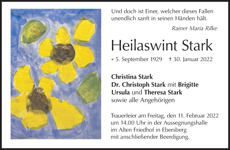 Hier finden Sie alle Traueranzeigen aus der Zeitung, die bisher für Heilaswint Stark erschienen sind. Weitere Traueranzeigen, die in der Zeitung erscheinen, werden hier ebenfalls aufgelistet