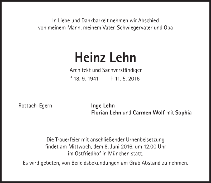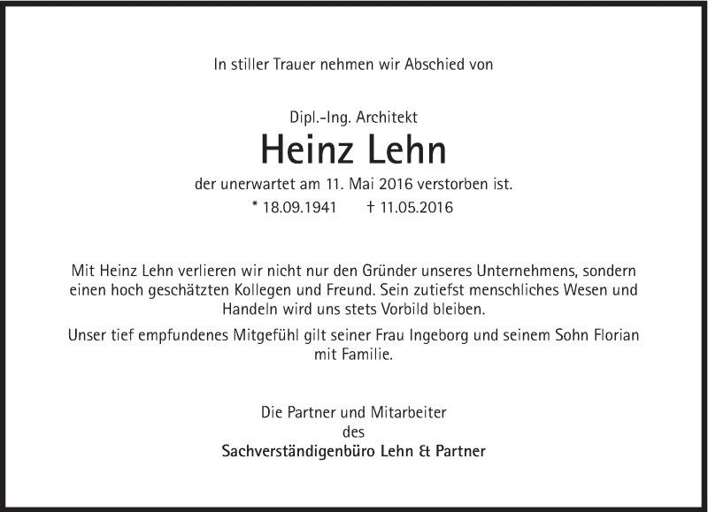 Hier finden Sie alle Traueranzeigen aus der Zeitung, die bisher für Heinz Lehn erschienen sind. Weitere Traueranzeigen, die in der Zeitung erscheinen, werden hier ebenfalls aufgelistet