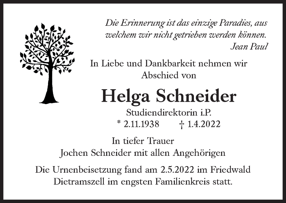 Hier finden Sie alle Traueranzeigen aus der Zeitung, die bisher für Helga Schneider erschienen sind. Weitere Traueranzeigen, die in der Zeitung erscheinen, werden hier ebenfalls aufgelistet