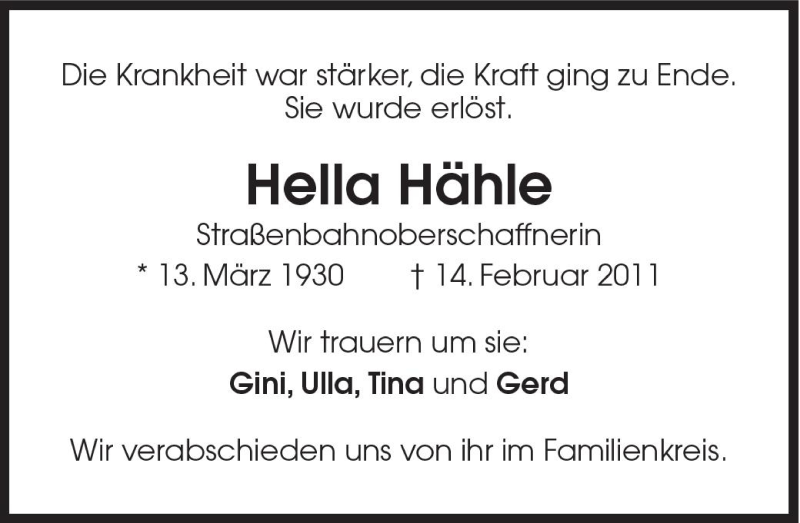 Hier finden Sie alle Traueranzeigen aus der Zeitung, die bisher für Hella Hähle erschienen sind. Weitere Traueranzeigen, die in der Zeitung erscheinen, werden hier ebenfalls aufgelistet