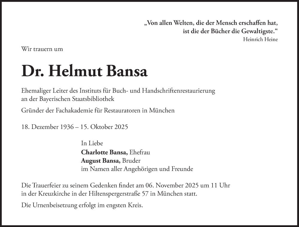 Hier finden Sie alle Traueranzeigen aus der Zeitung, die bisher für Helmut Bansa erschienen sind. Weitere Traueranzeigen, die in der Zeitung erscheinen, werden hier ebenfalls aufgelistet