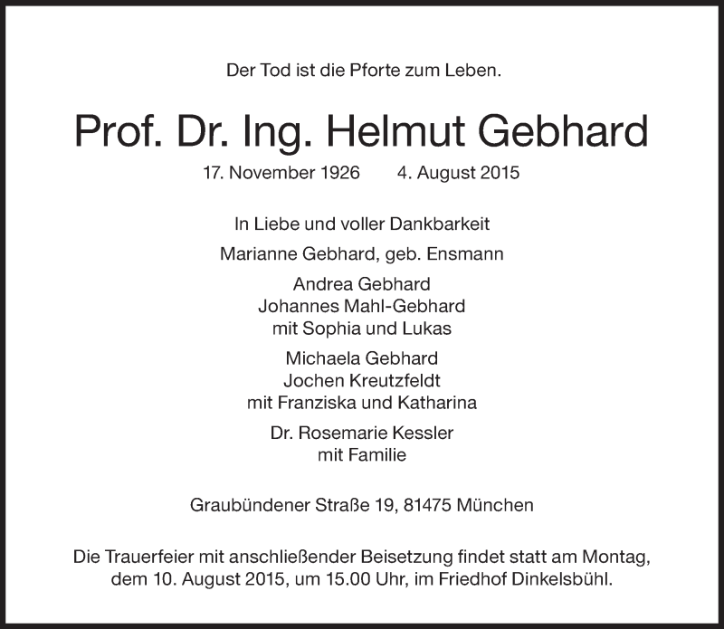 Hier finden Sie alle Traueranzeigen aus der Zeitung, die bisher für Prof. Dr. Ing. Helmut Gebhard erschienen sind. Weitere Traueranzeigen, die in der Zeitung erscheinen, werden hier ebenfalls aufgelistet