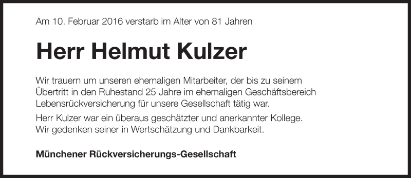 Hier finden Sie alle Traueranzeigen aus der Zeitung, die bisher für Helmut Kulzer erschienen sind. Weitere Traueranzeigen, die in der Zeitung erscheinen, werden hier ebenfalls aufgelistet