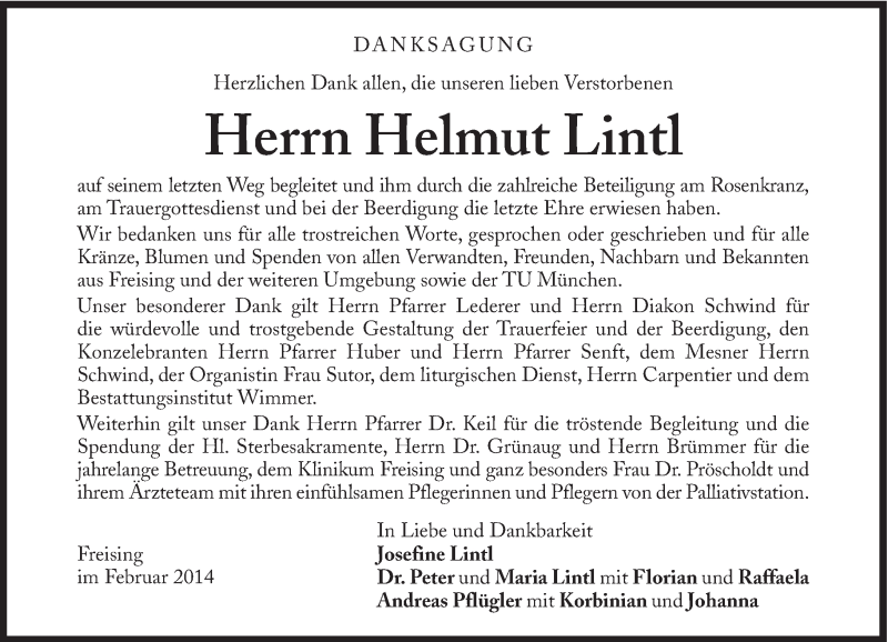 Hier finden Sie alle Traueranzeigen aus der Zeitung, die bisher für Helmut Lintl erschienen sind. Weitere Traueranzeigen, die in der Zeitung erscheinen, werden hier ebenfalls aufgelistet