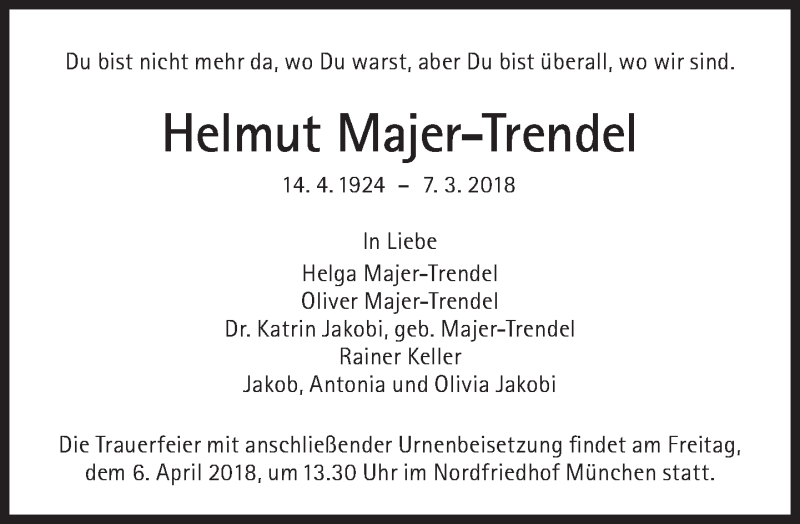Hier finden Sie alle Traueranzeigen aus der Zeitung, die bisher für Helmut Majer-Trendel erschienen sind. Weitere Traueranzeigen, die in der Zeitung erscheinen, werden hier ebenfalls aufgelistet