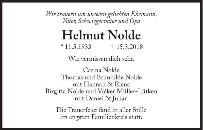 Hier finden Sie alle Traueranzeigen aus der Zeitung, die bisher für Helmut Nolde erschienen sind. Weitere Traueranzeigen, die in der Zeitung erscheinen, werden hier ebenfalls aufgelistet