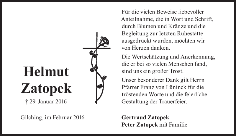 Hier finden Sie alle Traueranzeigen aus der Zeitung, die bisher für Helmut Zatopek erschienen sind. Weitere Traueranzeigen, die in der Zeitung erscheinen, werden hier ebenfalls aufgelistet