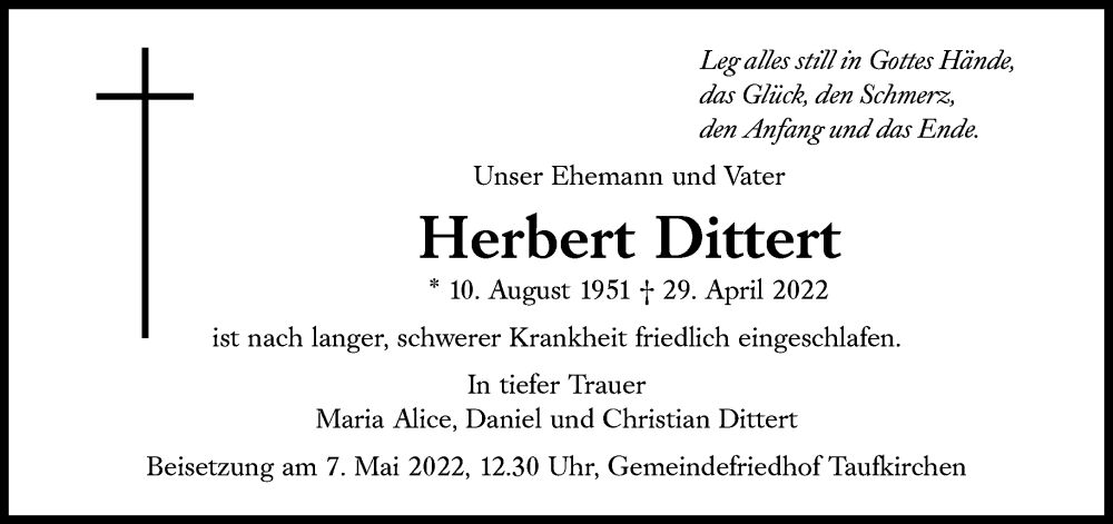 Hier finden Sie alle Traueranzeigen aus der Zeitung, die bisher für Herbert Dittert erschienen sind. Weitere Traueranzeigen, die in der Zeitung erscheinen, werden hier ebenfalls aufgelistet