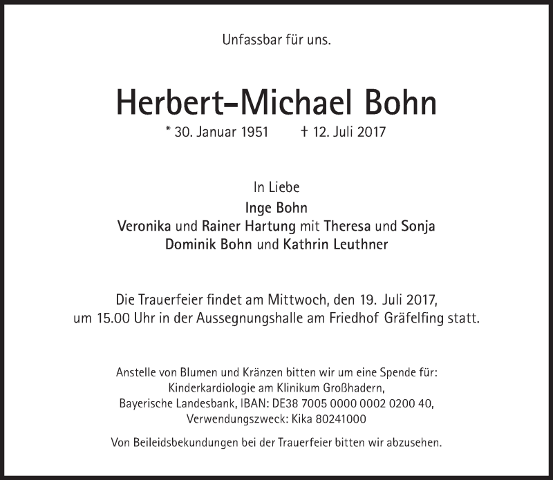 Hier finden Sie alle Traueranzeigen aus der Zeitung, die bisher für Herbert-Michael Bohn erschienen sind. Weitere Traueranzeigen, die in der Zeitung erscheinen, werden hier ebenfalls aufgelistet