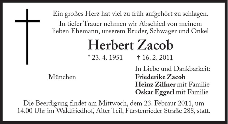 Hier finden Sie alle Traueranzeigen aus der Zeitung, die bisher für Herbert Zacob erschienen sind. Weitere Traueranzeigen, die in der Zeitung erscheinen, werden hier ebenfalls aufgelistet