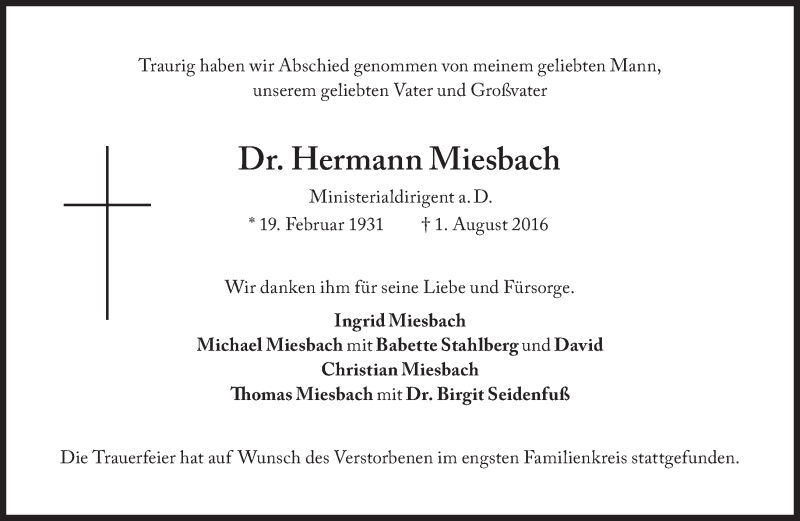 Hier finden Sie alle Traueranzeigen aus der Zeitung, die bisher für Hermann Miesbach erschienen sind. Weitere Traueranzeigen, die in der Zeitung erscheinen, werden hier ebenfalls aufgelistet