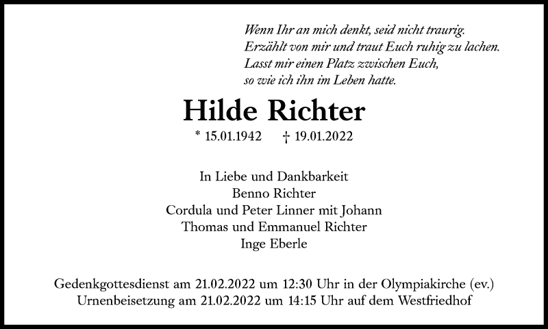 Hier finden Sie alle Traueranzeigen aus der Zeitung, die bisher für Hilde Richter erschienen sind. Weitere Traueranzeigen, die in der Zeitung erscheinen, werden hier ebenfalls aufgelistet