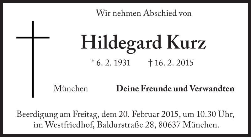 Hier finden Sie alle Traueranzeigen aus der Zeitung, die bisher für Hildegard Kurz erschienen sind. Weitere Traueranzeigen, die in der Zeitung erscheinen, werden hier ebenfalls aufgelistet
