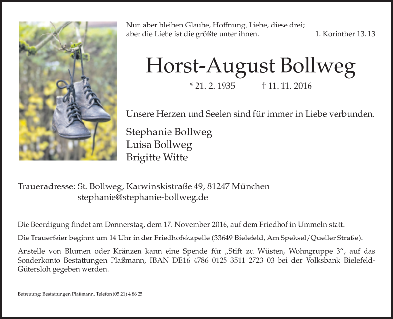 Hier finden Sie alle Traueranzeigen aus der Zeitung, die bisher für Horst-August Bollweg erschienen sind. Weitere Traueranzeigen, die in der Zeitung erscheinen, werden hier ebenfalls aufgelistet