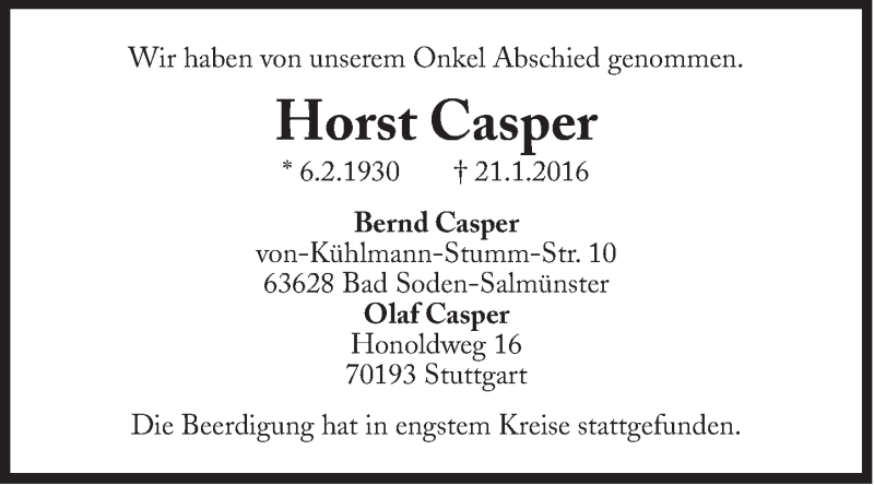 Hier finden Sie alle Traueranzeigen aus der Zeitung, die bisher für Horst Casper erschienen sind. Weitere Traueranzeigen, die in der Zeitung erscheinen, werden hier ebenfalls aufgelistet