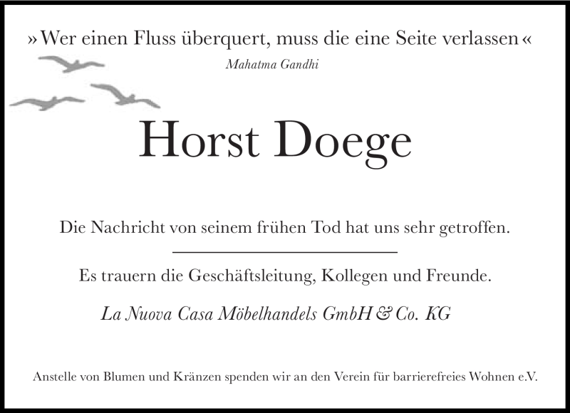 Hier finden Sie alle Traueranzeigen aus der Zeitung, die bisher für Horst Doege erschienen sind. Weitere Traueranzeigen, die in der Zeitung erscheinen, werden hier ebenfalls aufgelistet