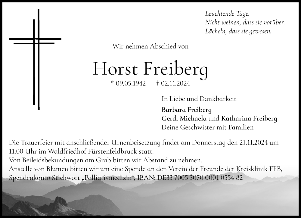 Hier finden Sie alle Traueranzeigen aus der Zeitung, die bisher für Horst Freiberg erschienen sind. Weitere Traueranzeigen, die in der Zeitung erscheinen, werden hier ebenfalls aufgelistet
