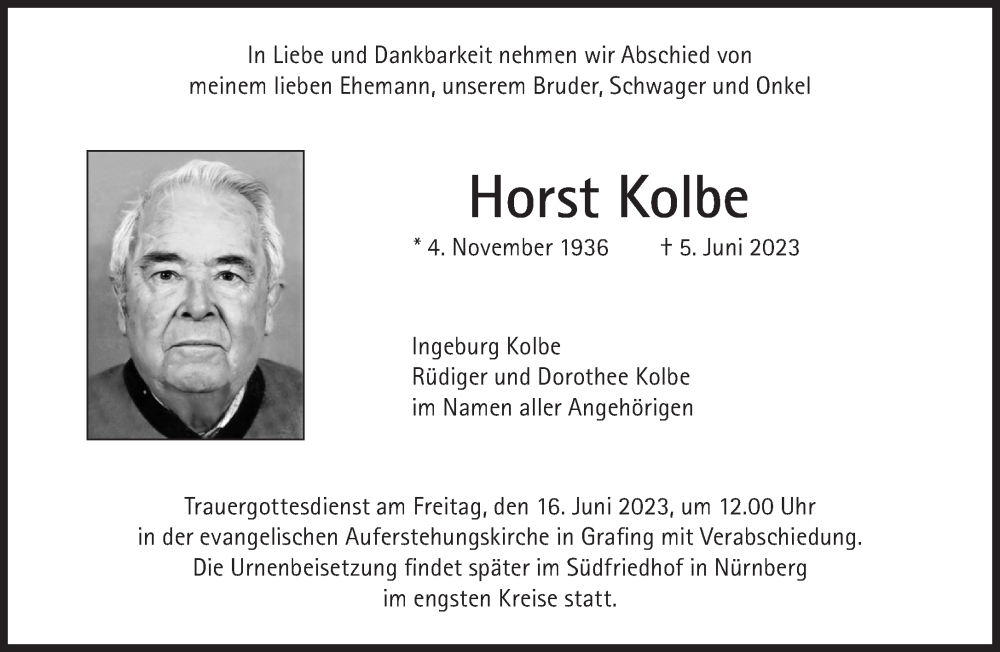 Hier finden Sie alle Traueranzeigen aus der Zeitung, die bisher für Horst Kolbe erschienen sind. Weitere Traueranzeigen, die in der Zeitung erscheinen, werden hier ebenfalls aufgelistet