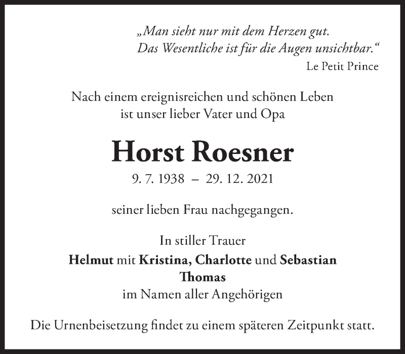 Hier finden Sie alle Traueranzeigen aus der Zeitung, die bisher für Horst Roesner erschienen sind. Weitere Traueranzeigen, die in der Zeitung erscheinen, werden hier ebenfalls aufgelistet